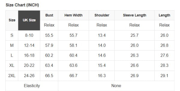 See size chart for approximate measurements.