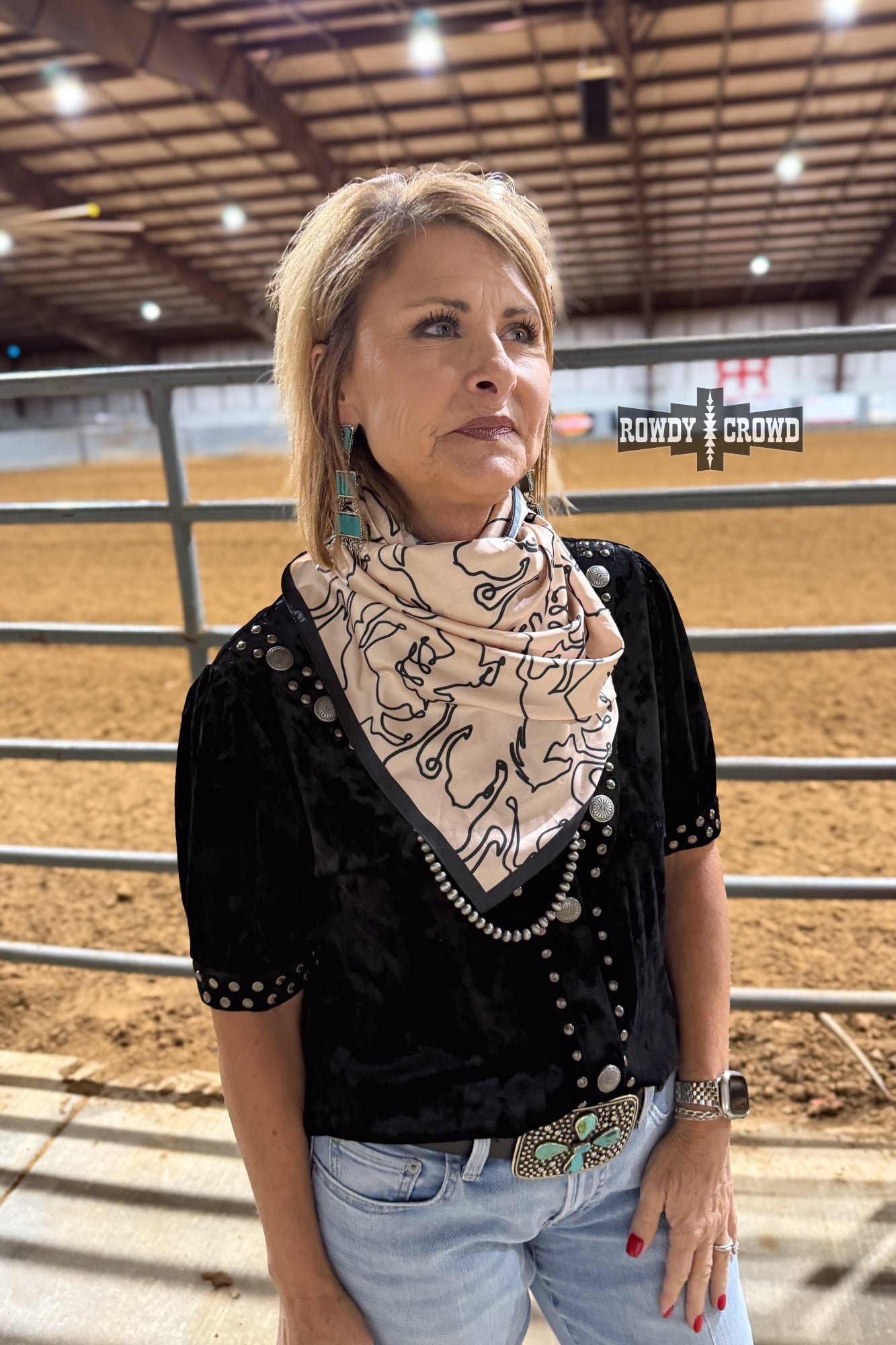 The Mustang Magic Wild Rag brings an artsy, modern twist to western style. Its soft cream base is covered in a free-flowing line-art print of galloping horses, outlined in bold black for a look that’s both subtle and striking. Trimmed with a clean black border, this silky wild rag drapes beautifully and ties like a dream.